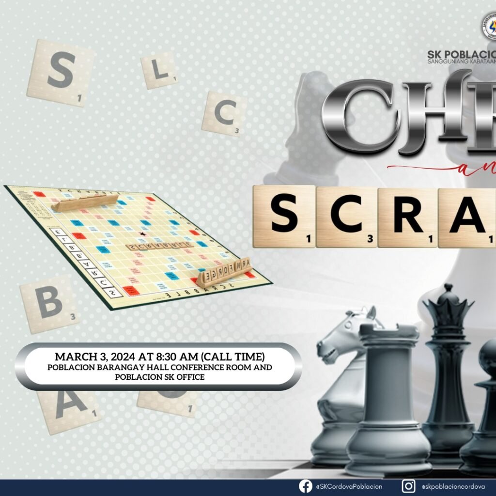 The SK Poblacion Officials invite the youth of Poblacion to engage their minds in a thrilling battle of strategy and intellect! This year, we proudly present our Chess and Scrabble Tournament, where masterminds clash on the chessboard and word wizards dominate the Scrabble grid.