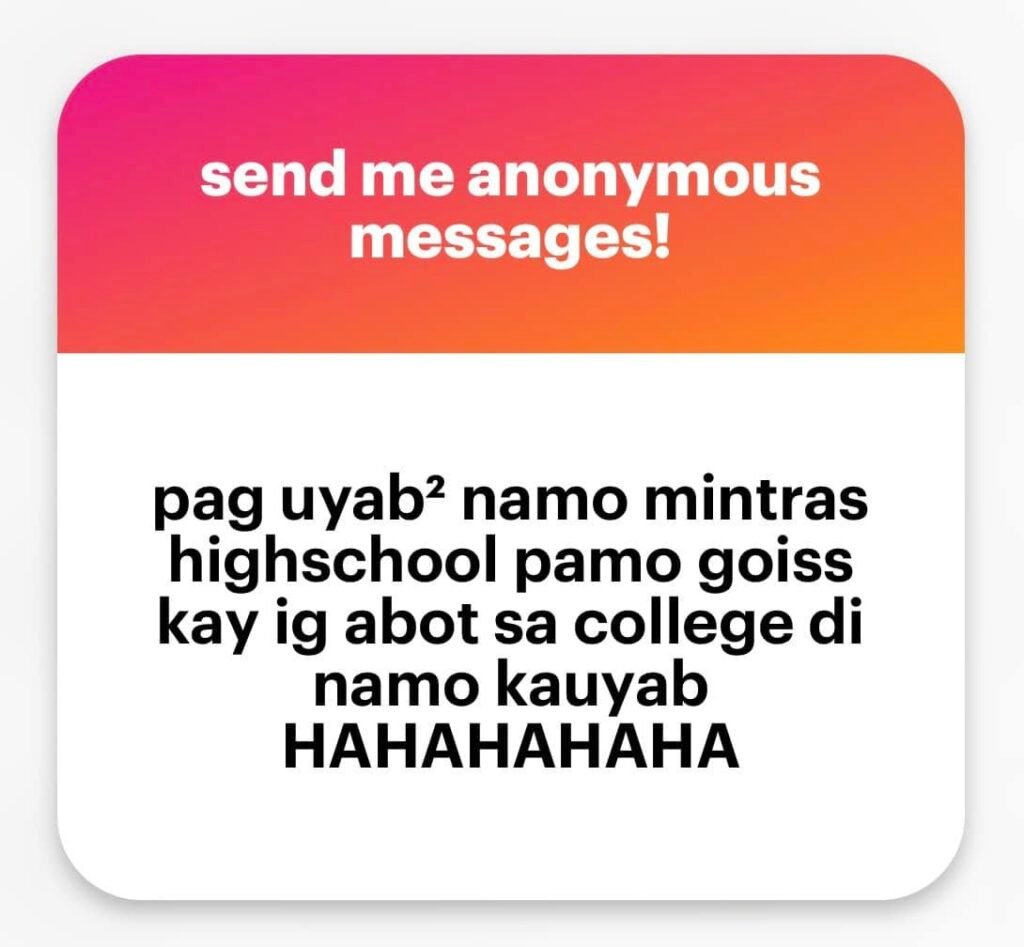 Send in your anonymous confessions through our NGL link. You can greet your buddies, your crush, your murag friends, the one who got away, or anyone youโd like! ๐ญ๐