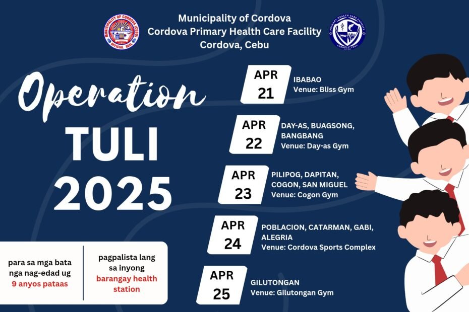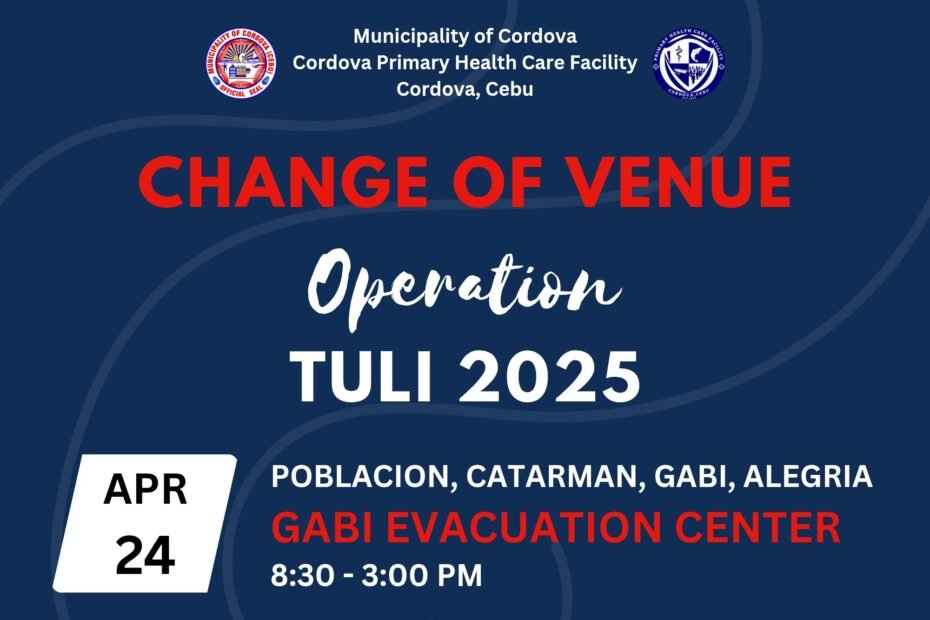 Buot namong ipahibalo sa tanan nga adunay kausaban sa venue sa Operation Tuli nga ipahigayon ugma, April 24, 2025 para sa mga mosunod nga barangay:β Brgy. Poblacionβ Brgy. Catarmanβ Brgy. Gabiβ Brgy. Alegria π BAG-ONG… π’ OPERATION TULI ANNOUNCEMENT β