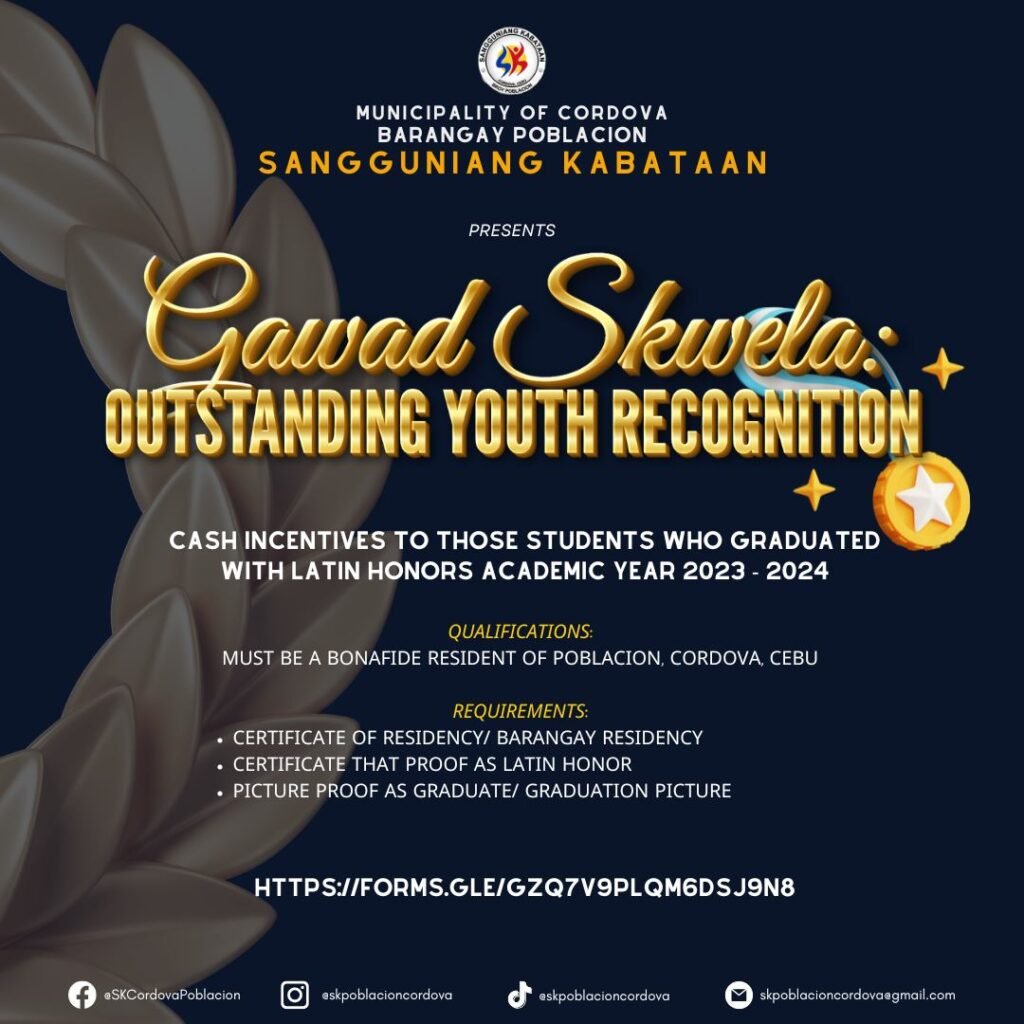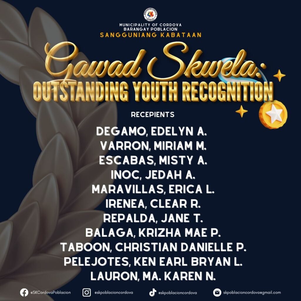 Congratulations to this yearβs recipients of SK Poblacion Cordovaβs Gawad SKwela: Outstanding Youth Recognition! πβ¨This…